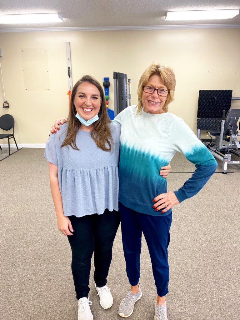 Ms. Jones is shown here with her Physical Therapist Assistant Allison!