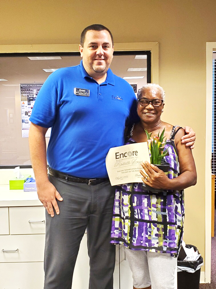 Say hello to our Patient of the Month, Rosetta Screws! Ms. Screws chose Encore Rehabilitation-Eufaula to be her Rehab Provider following her recent knee surgery. We have enjoyed her bright smile each time she came to rehab. She has been very diligent with following her exercise program and we are proud of her progress. We will miss you, Ms. Screws, and wish you all the best!
