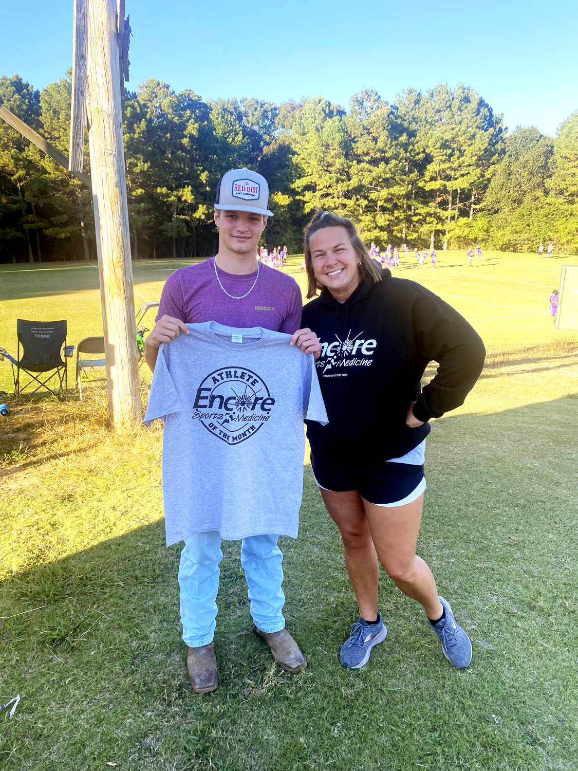 Caden is shown here with Encore Sports Medicine Athletic Trainer Lindsey Kent Walker.