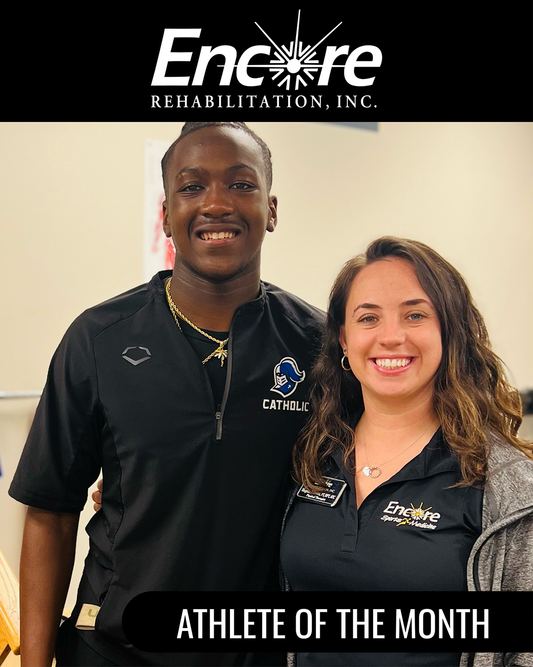 Xavier is pictured here with Encore Physical Therapist Meghan Johnson. Encore Sports Medicine is proud to be the Official Sports Medicine Provider for Montgomery Catholic Athletics. Go, Knights!