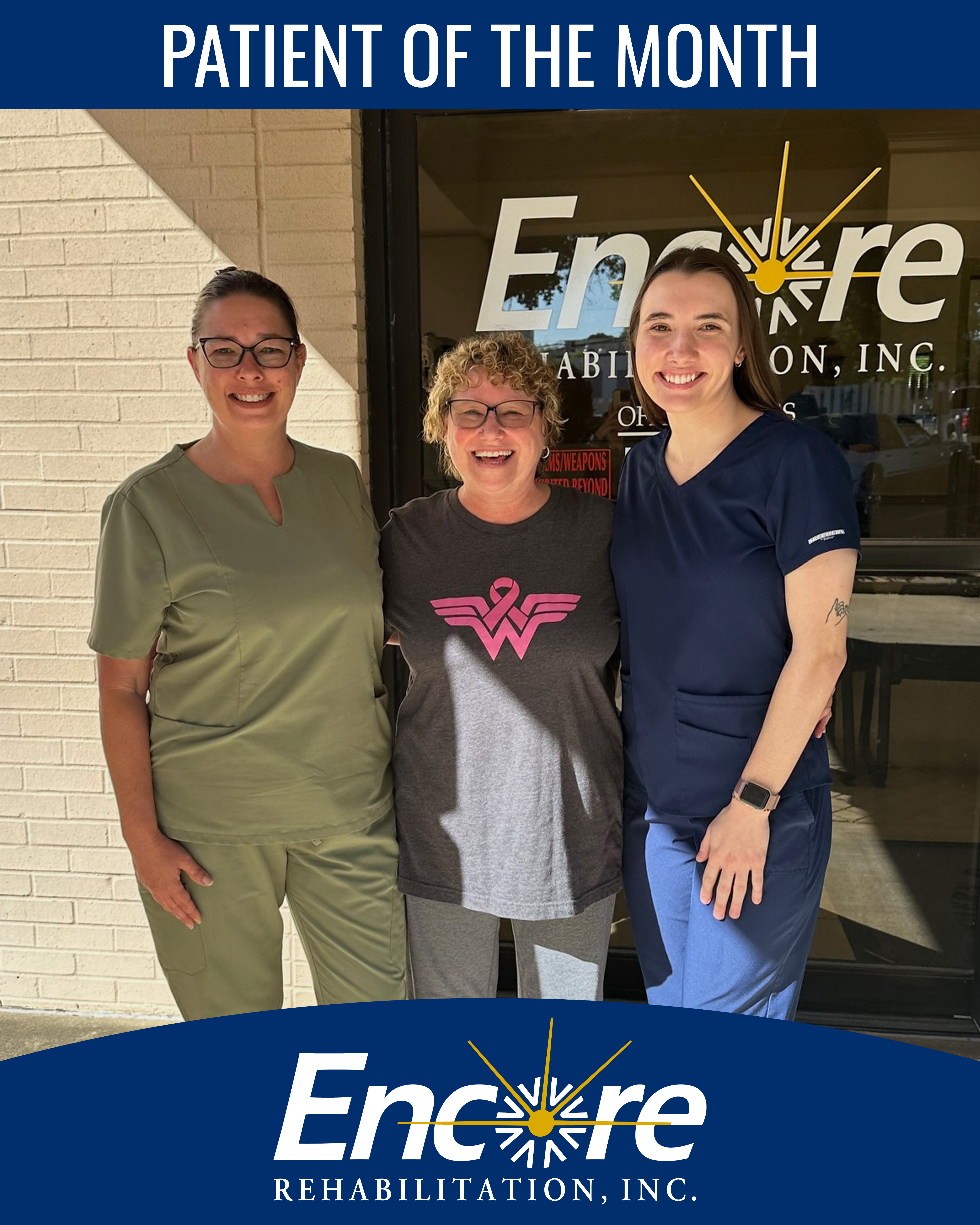 We are proud to be part of her recovery journey and delighted she trusted Encore with her care once again! She is shown here with Physical Therapist Assistants Holiday Rigdon and Hailey Dalton.