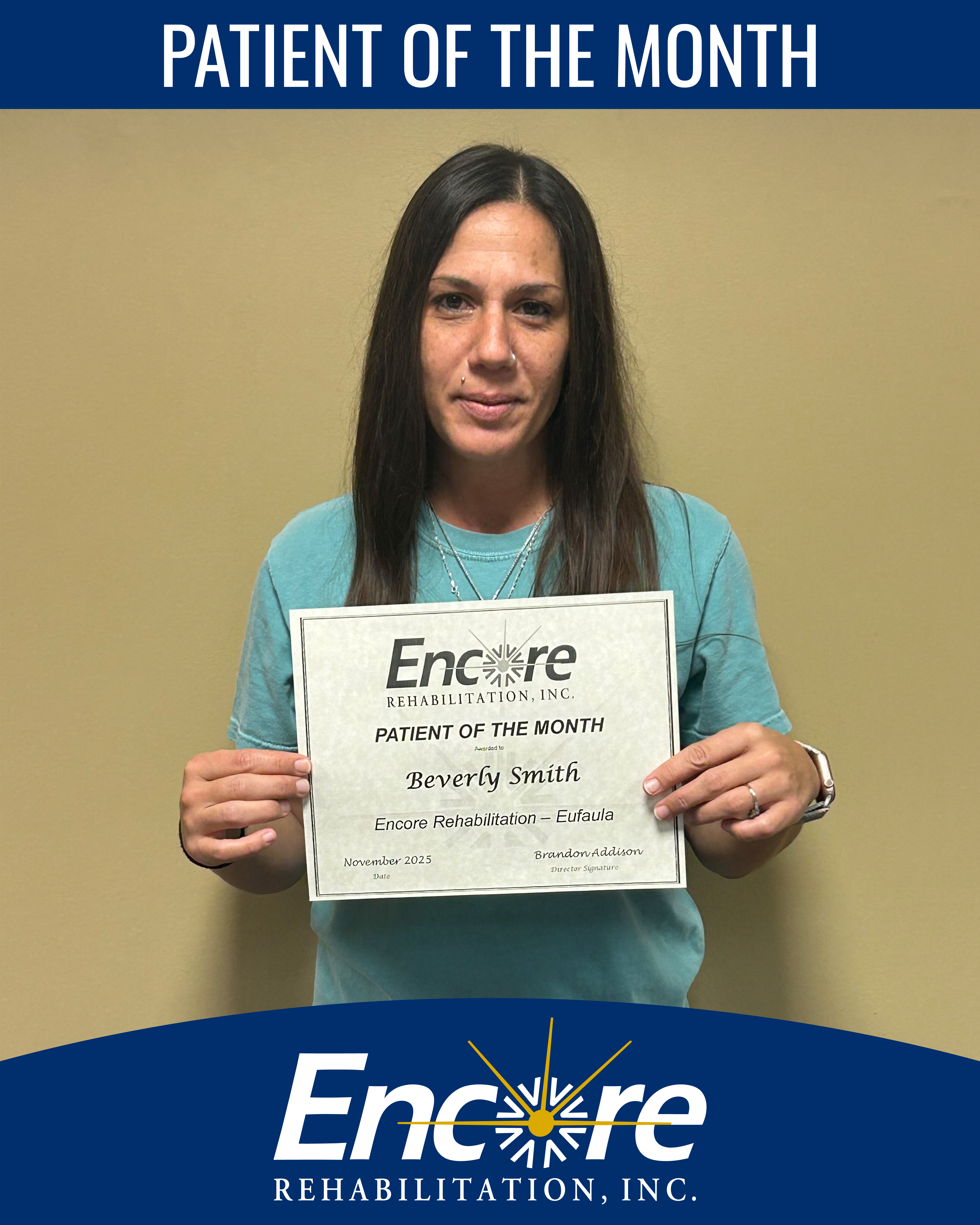 Thank you, Ms. Smith for choosing Encore Rehabilitation-Eufaula to be your Rehab Provider of choice! We LOVE to see you move and are very proud to select you as our Patient of the Month! We wish you continued good health!