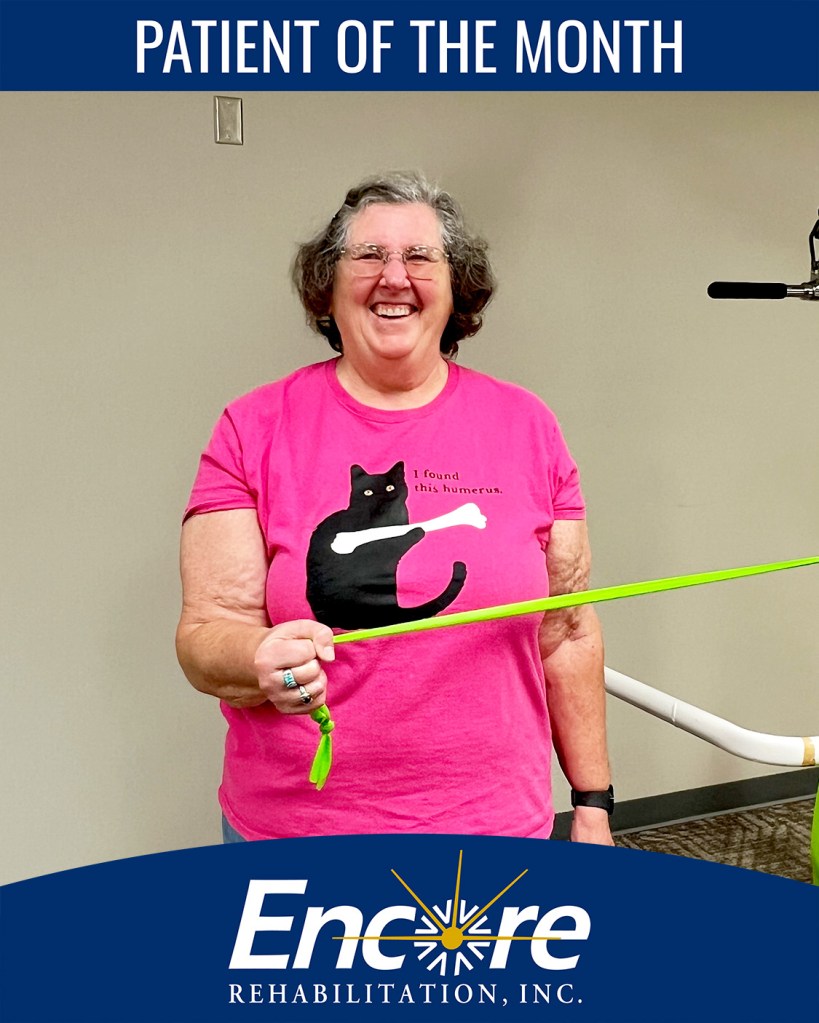 We are so pleased you are moving again, Ms. Anderson! Thank you for entrusting Encore Rehabilitation-Pelham to be your rehab provider! We are proud to select you as our Patient of the Month!