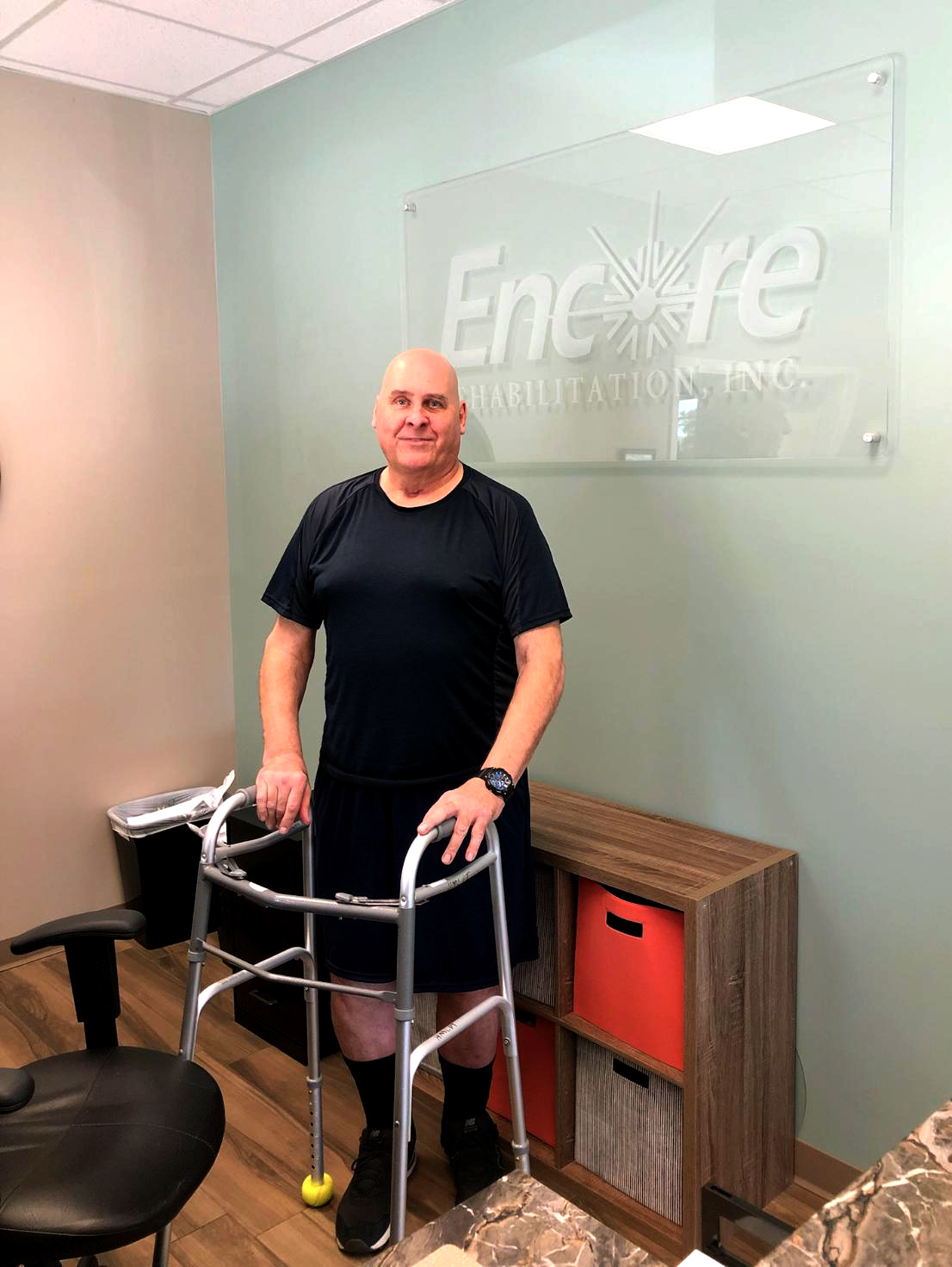 Mr. Russell was hospitalized due to covid. He was in the hospital for 59 days and in a coma for 5 weeks. With the use of Physical Therapy at Encore, Mr. Russell has relearned how to stand, walk and resume many daily tasks.
