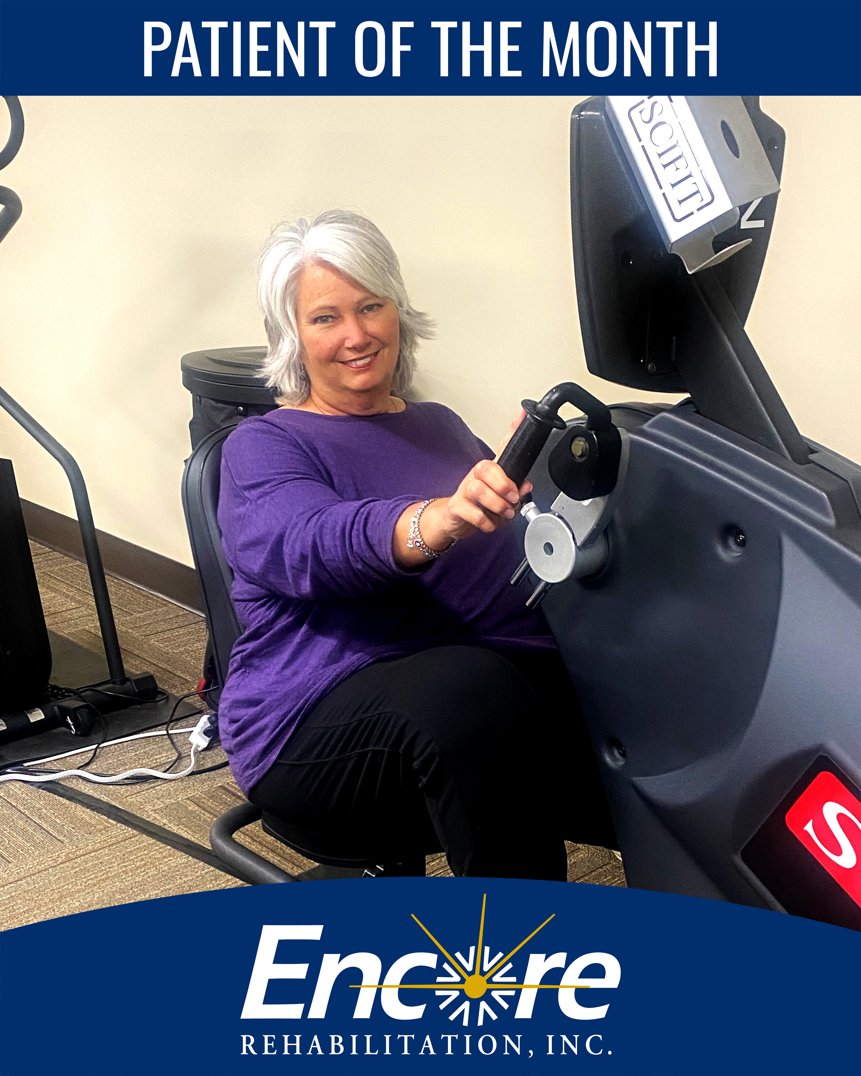 We are happy to select Ms. O’Connor as Patient of the Month! Thank you for choosing Encore Rehabilitation, Ms. O’Connor! We are so proud of your progress and fantastic attitude! We also miss seeing you in the clinic and wish you continued success!