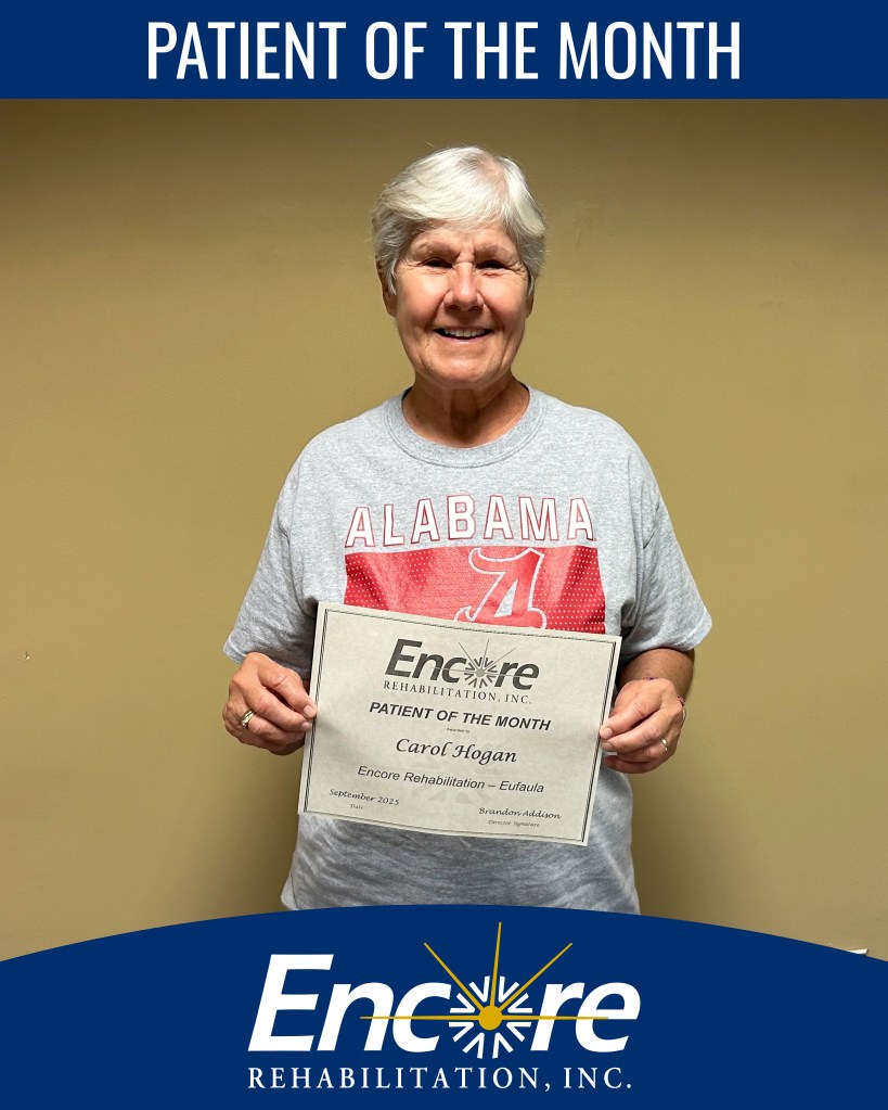 We are proud to select Ms. Hogan as our Patient of the Month at Encore Rehabilitation-Eufaula! She has demonstrated remarkable dedication to following her treatment plan and made great progress. We wish you continued good health and much happiness, Ms. Hogan! Thank you for choosing Encore!