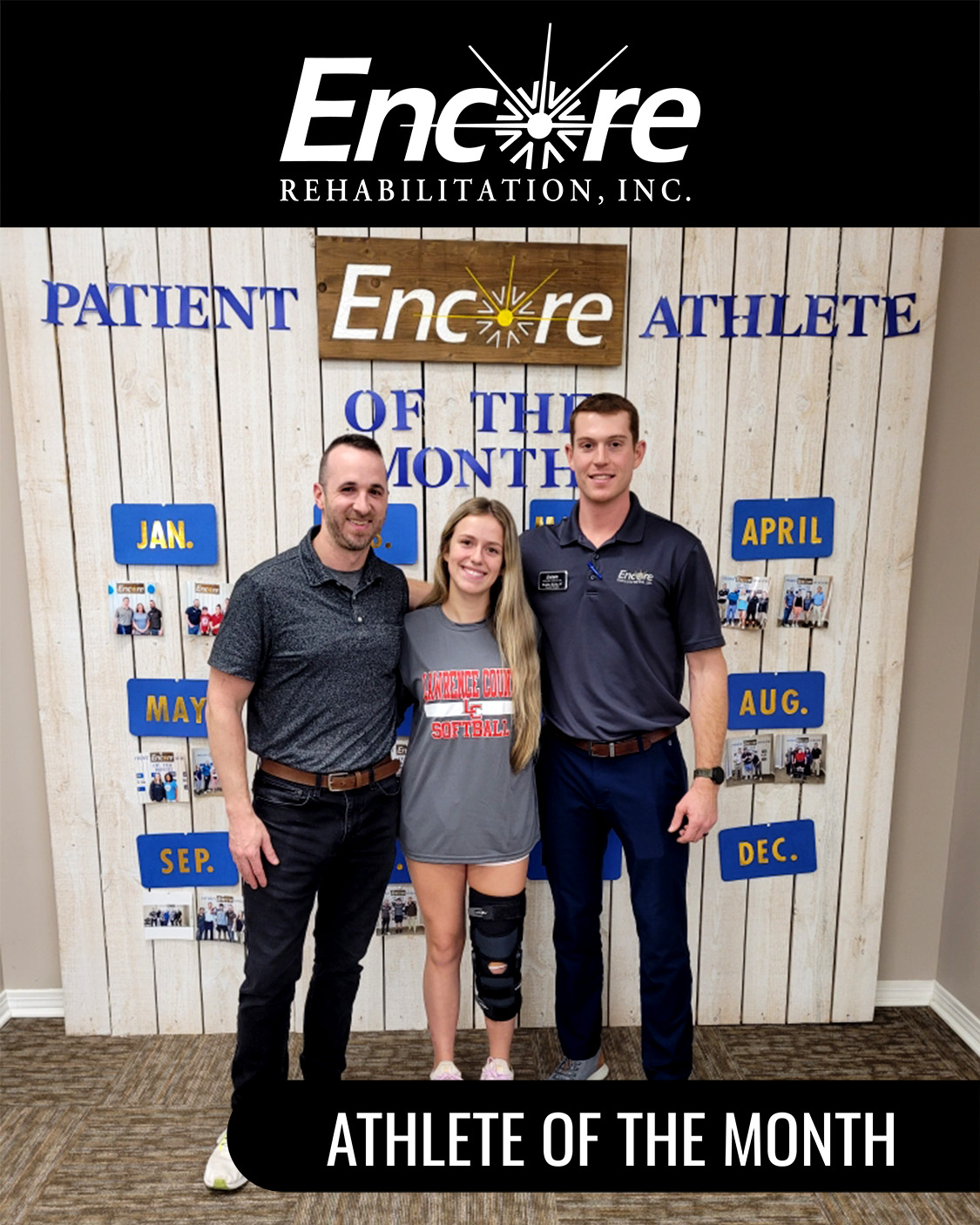 We are proud of you, Addison! Thank you for being our Athlete of the Month! Addison is shown here with Brett Ferguson, LPTA, and Clinic Director Bradley Bailey, PT, DPT.