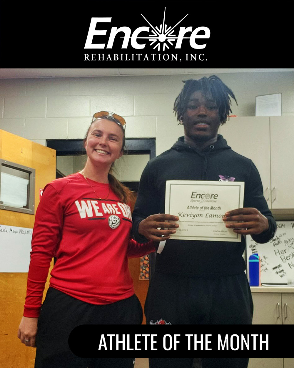 Keviyon is pictured here with Encore Sports Medicine Athletic Trainer Carla Mayo.