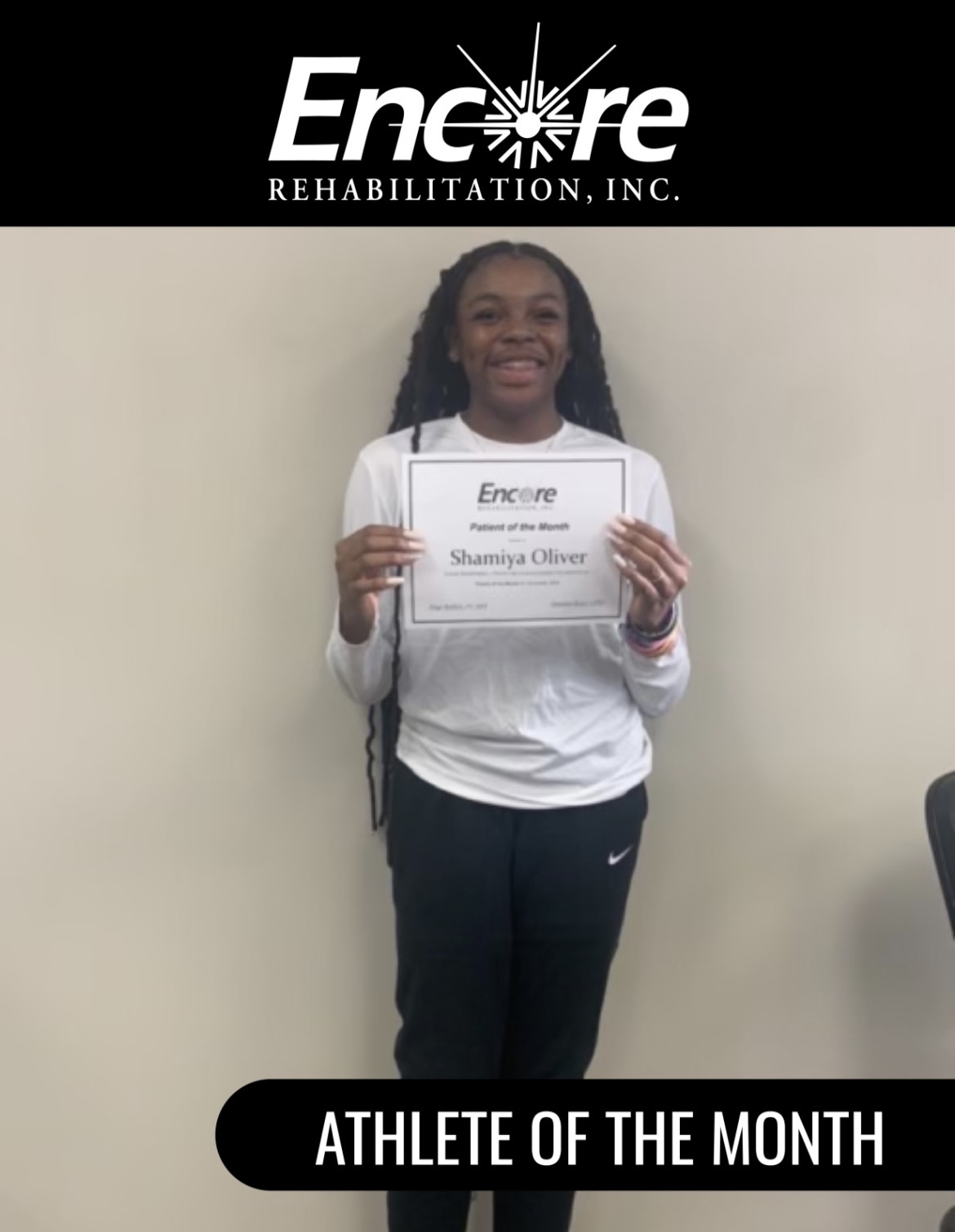 Shamiya is the daughter of Tamika and Shamond Oliver. We are so proud of you, Shamiya, and wish you the best in all of your future endeavors! Thank you for trusting Encore with your Physical Therapy needs.
